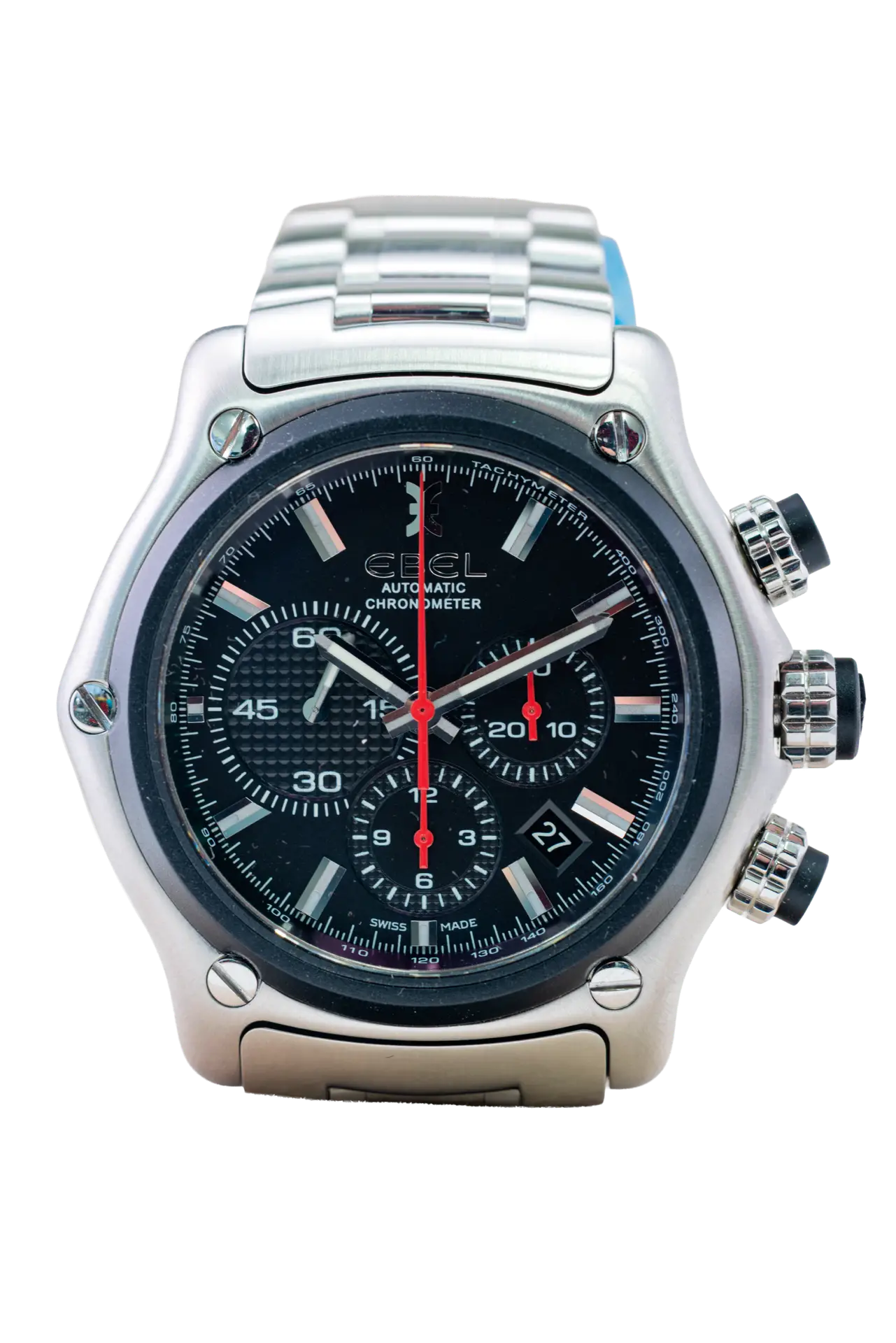 Ebel BTR Chronographe – Montre mécanique à remontage automatique. Mouvement exclusif à Ebel certifié COSC : calibre 137 (sur base Lémania 1350). Cadran noir carbone tressé triple compteurs avec petites secondes à 9 heures et compteurs des heures et des minutes du chronographe à 6 heures et 3 heures avec date à 16h30 heures, Aiguille du chrono en rouge, aiguilles luminescentes et verre saphir antireflet. Tachymètre gravé dans le rehaut du cadran. Couronne vissée avec sigle Ebel. Fond transparent, masse oscillante en forme de E Bracelet intégré en acier.